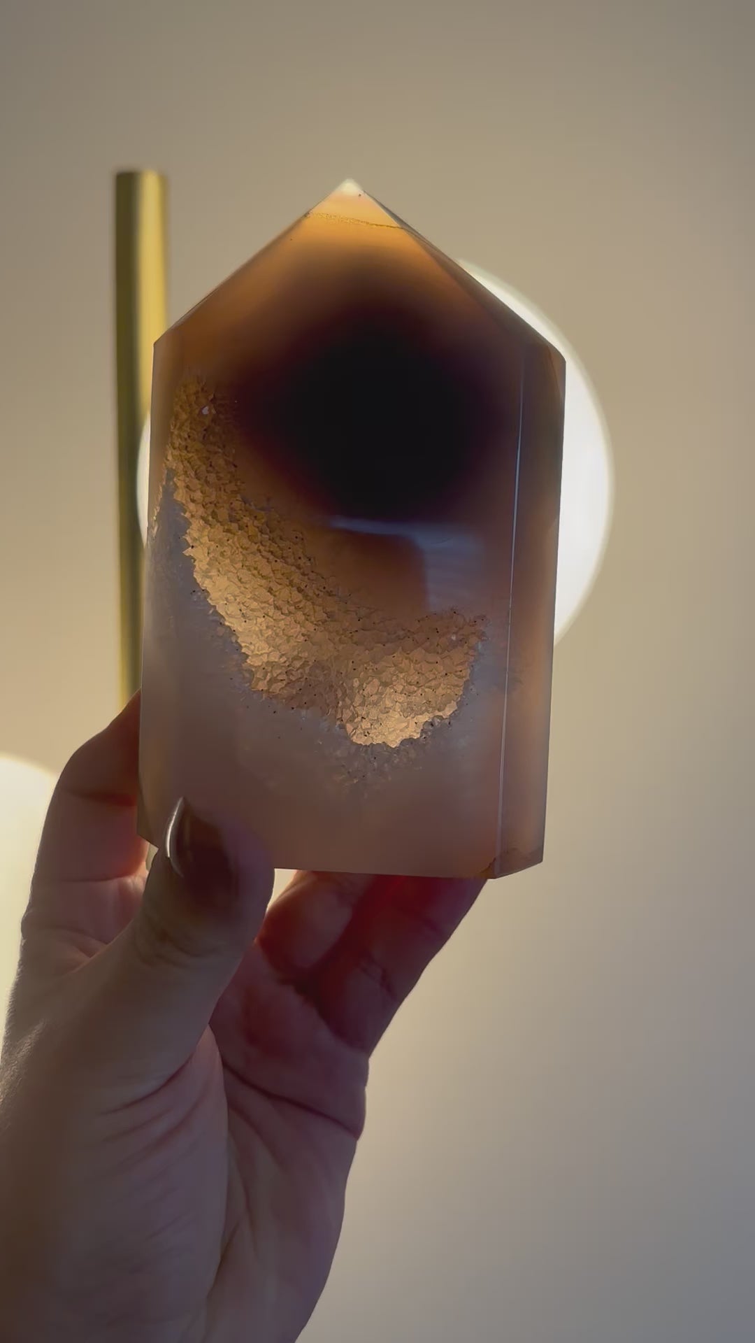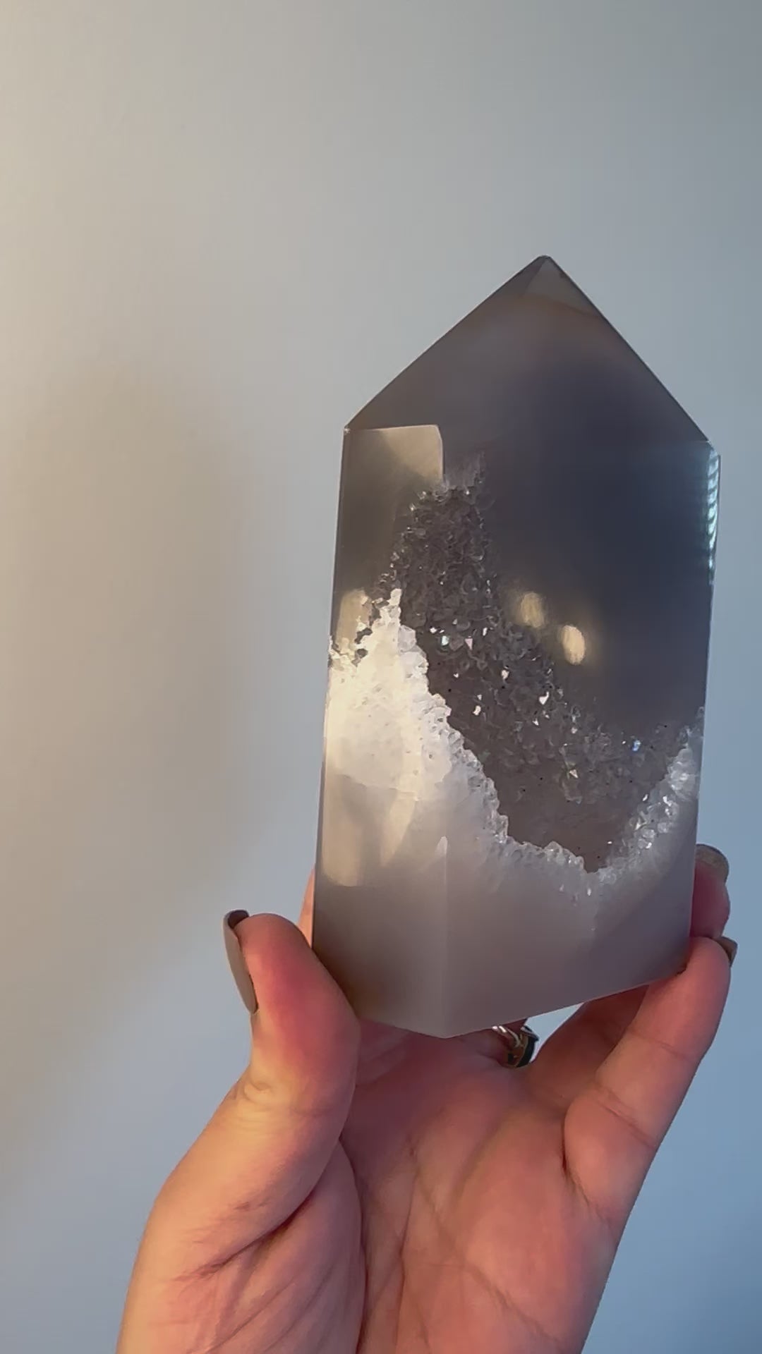 If I were to recreate a perfect example of a high-grade Agate tower with druzy, this would be it. This agate specimen is so well-balanced. The artisans that hand polished this tower worked around the sugar druzy pocket to turn it into its main feature (see closer to find the Goethite speckles inside!) The natural grading of colors ranging from light grey to blue-gray is just the cherry on top for me. This beauty is ready to be displayed and be bragged about.