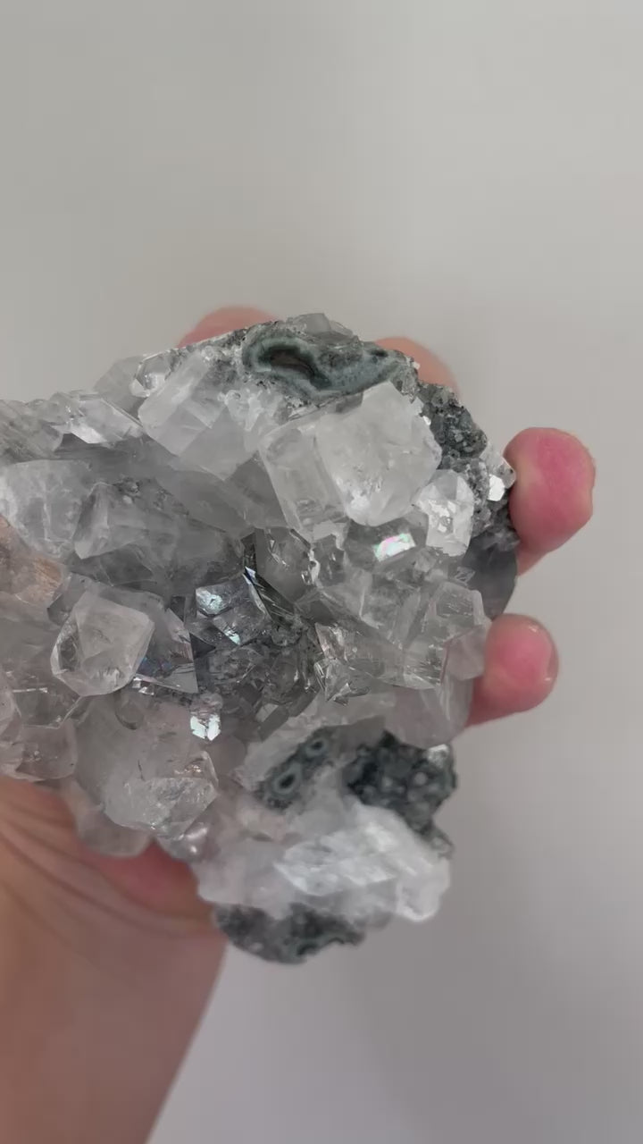 This alluring Apophyllite cluster features solid, gorgeous and glassy points throughout. Note the tiny druzy pockets as well as the beautiful Jasper eyes in blue hues. This is one piece that falls under the display perfection category. Rose gold stand not included but do display this beauty with any of our cluster stands in the altar section.