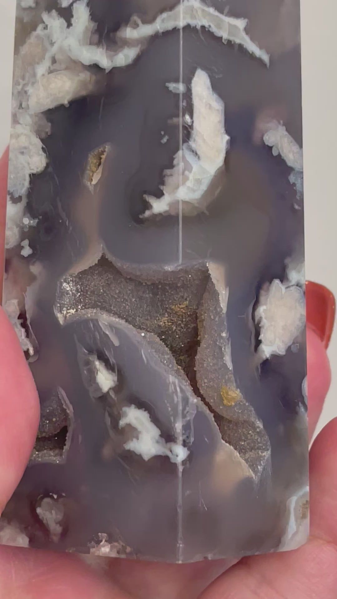 Black Flower Agate tower with Druzy pockets from Madagascar. Gorgeous medium sized tower.