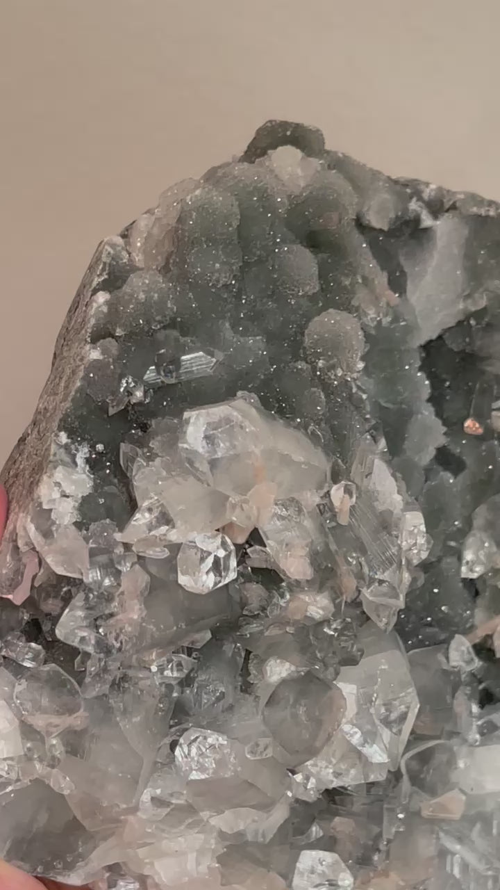 Mother nature did a fantastic job with this gorgeous Blue Chalcedony with Apophyllite cluster. The druzy pockets look like magical coral from another world. If that somehow doesn't elevate your crystal pulse, direct your attention to the plethora of Apophyllite clear and peach points throughout the entire matrix. Rose gold stand not included but do display this beauty with any of our cluster stands in the altar section. Watch the video and be dazzled by its beauty.