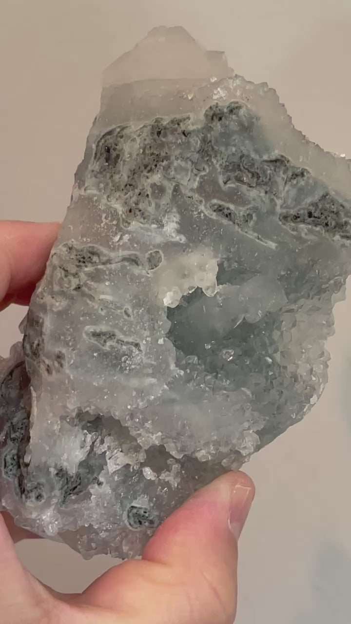 If you ever wanted to own an all-druzy specimen in your collection, this is your chance! This mesmerizing beautiful piece is all about the high vibes and it's definitely here for a good time. If there was ever a crystal equivalent to expensive champagne, this is it. Its dreamy blue hue is just the cherry on top-- Apophyllite points and Jasper eyes on its sides complete the look. Rose gold stand not included but do display this beauty with any of our cluster stands in the altar section. Watch the video and be dazzled by its beauty.