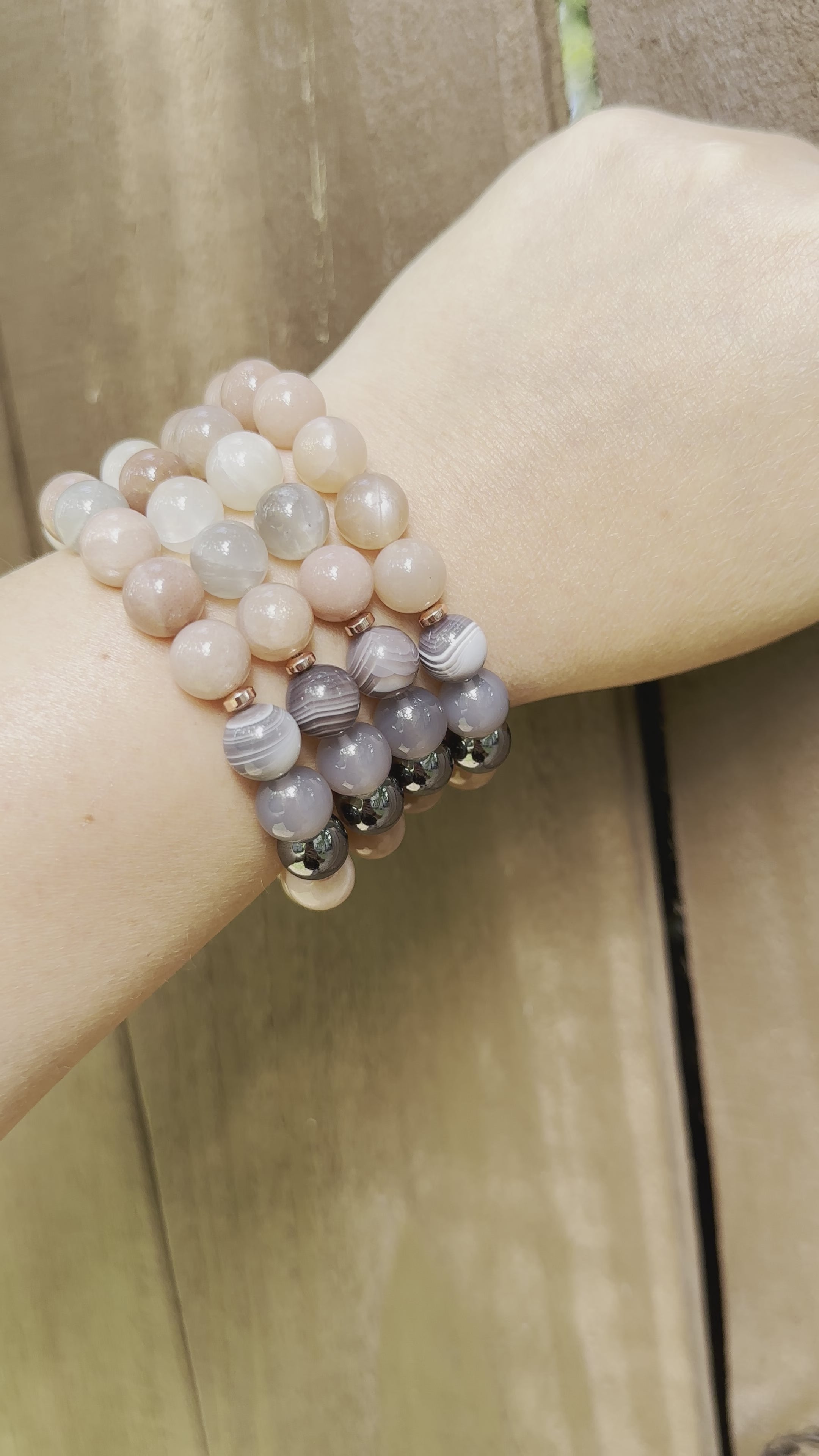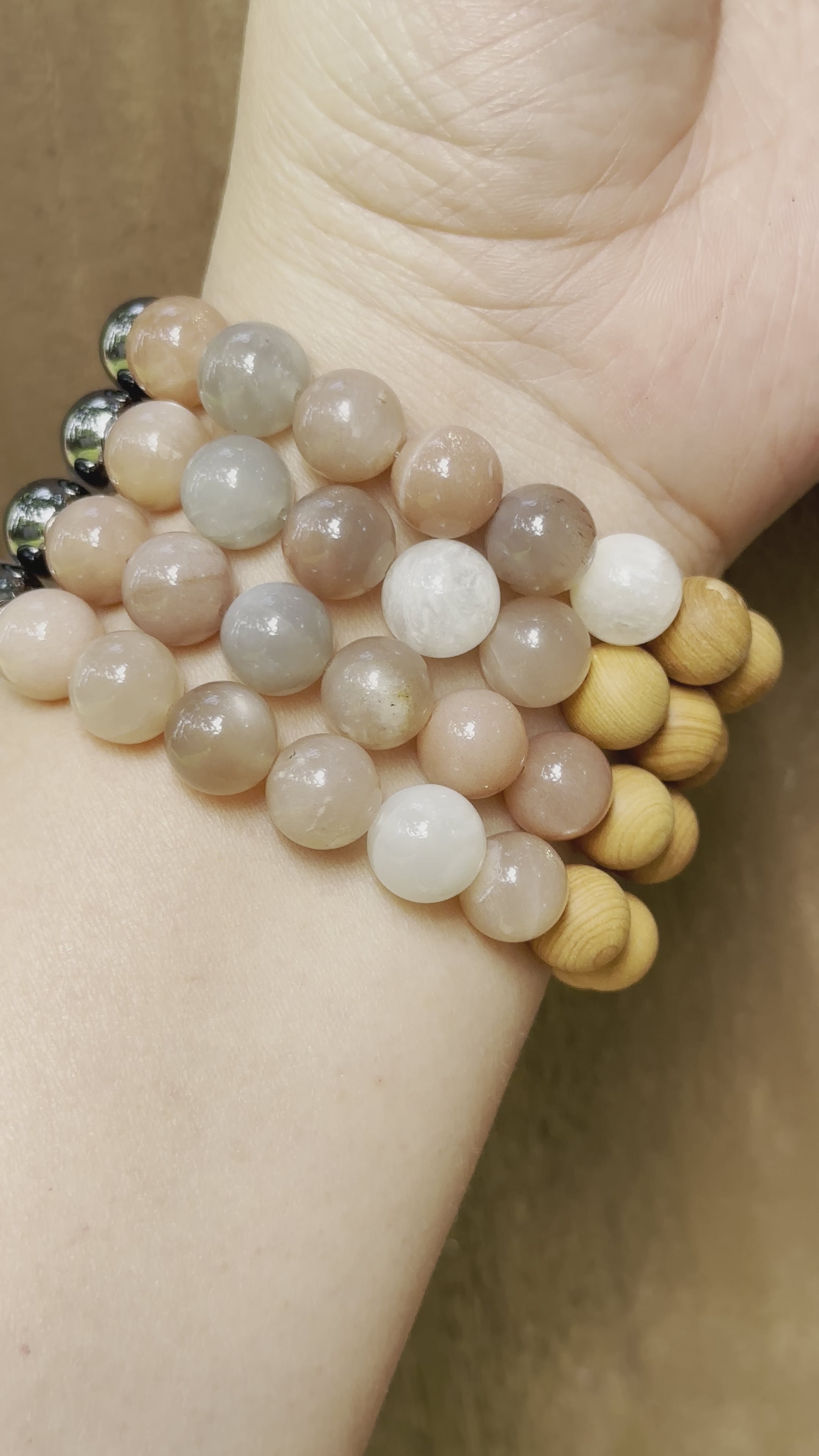 Handmade Natural Gemstone Bracelet with Rainbow Mooonstone, Agate, Hematite and Cypress wood beads.10mm bracelet.