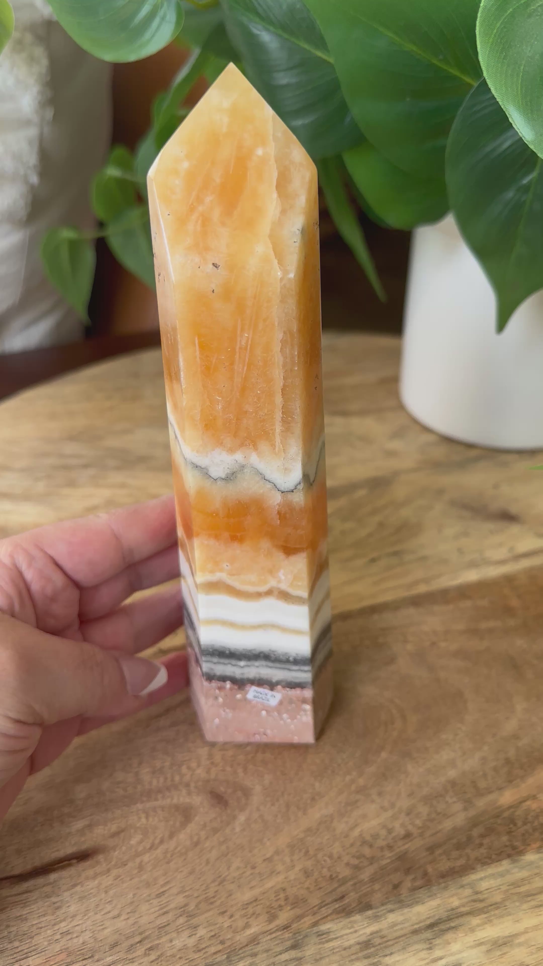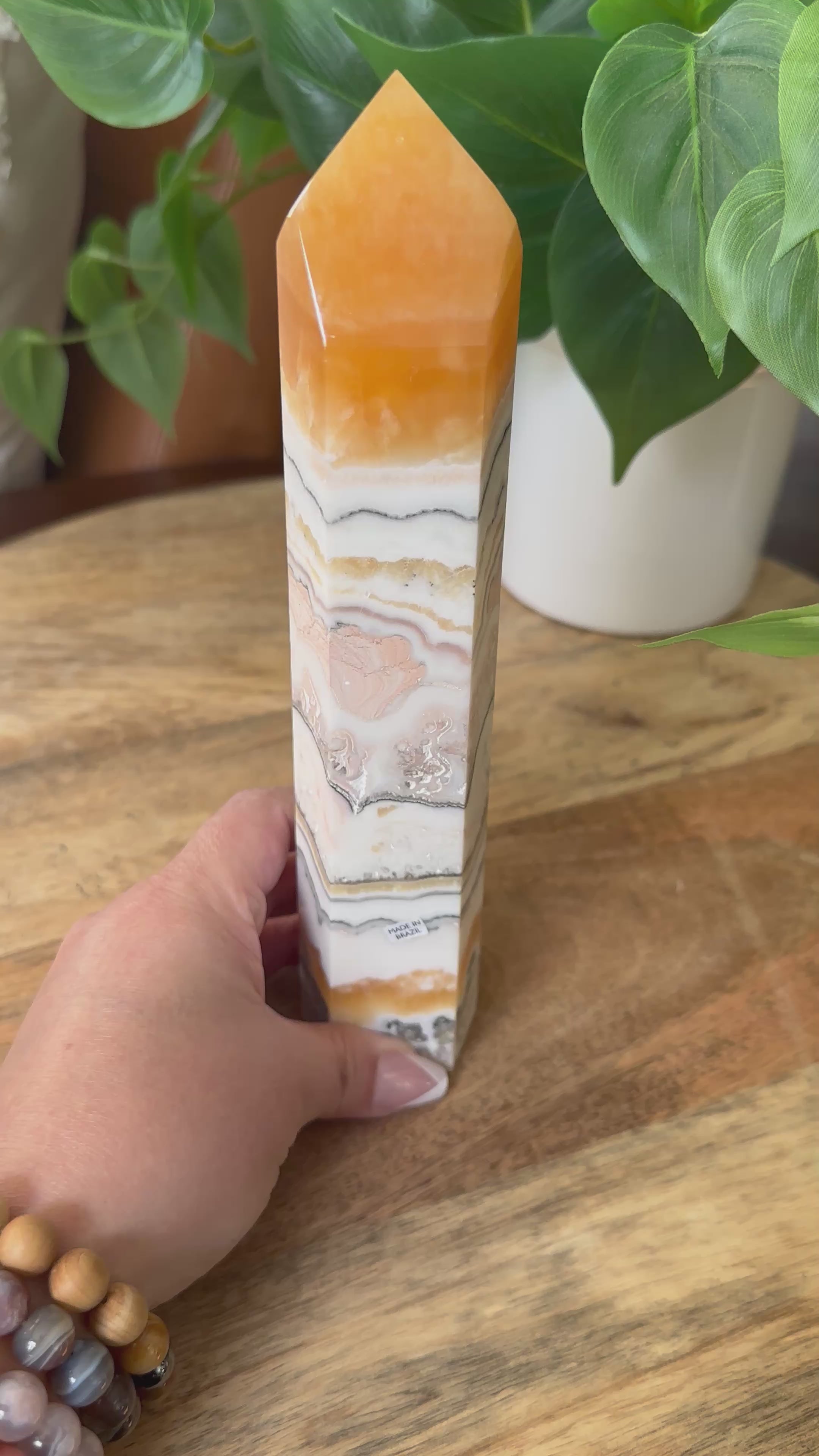 Never encountered before the combination of orange calcite and chalcedoni. These Brazilian polished towers are simply gorgeous and their energy will elevate any space in your home. Their points are impeccable and their natural wavy patterns are unbelievable.