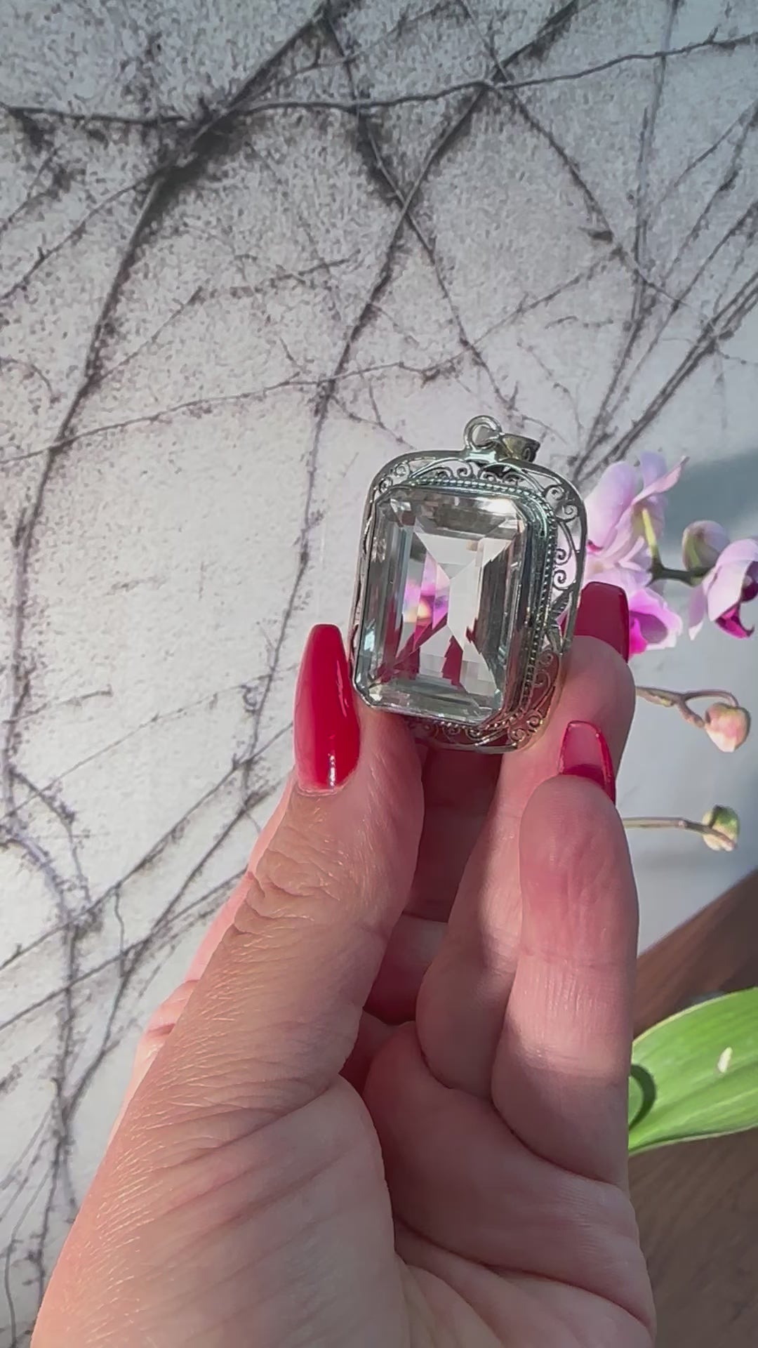 Elevate your wardrobe with this exquisite sterling silver pendant that perfectly holds a stunning genuine polished quartz gemstone with mesmerizing clarity. Its allure and sophistication will add a touch of luxury to any outfit. Necklace not included. Hand-crafted in India.