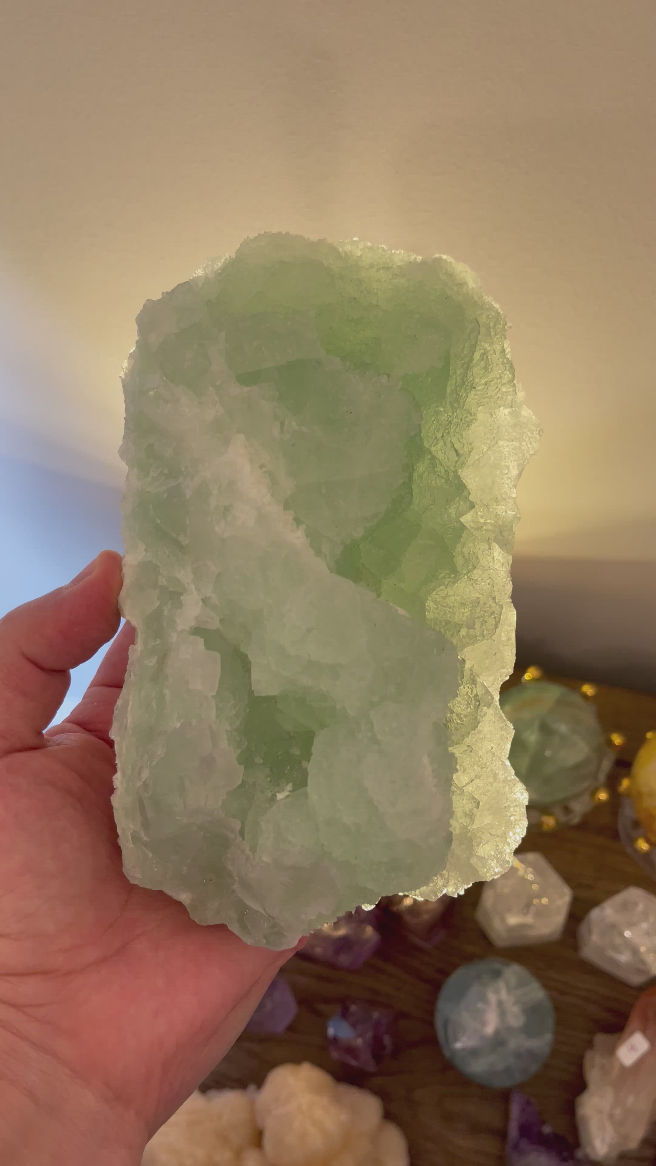 Perfect mint green fluorite cluster from Chenzhou, Hunan - China, where all the amazing fluorite clusters come from.This light mint green fluorite cluster specimen is extremely calming and full of shimmer. Small acrylic stand is included with purchase, but if you want to display this beauty elegantly, check out the medium and large rose gold metal stands in the Altar section. Picture showcases the large stand.