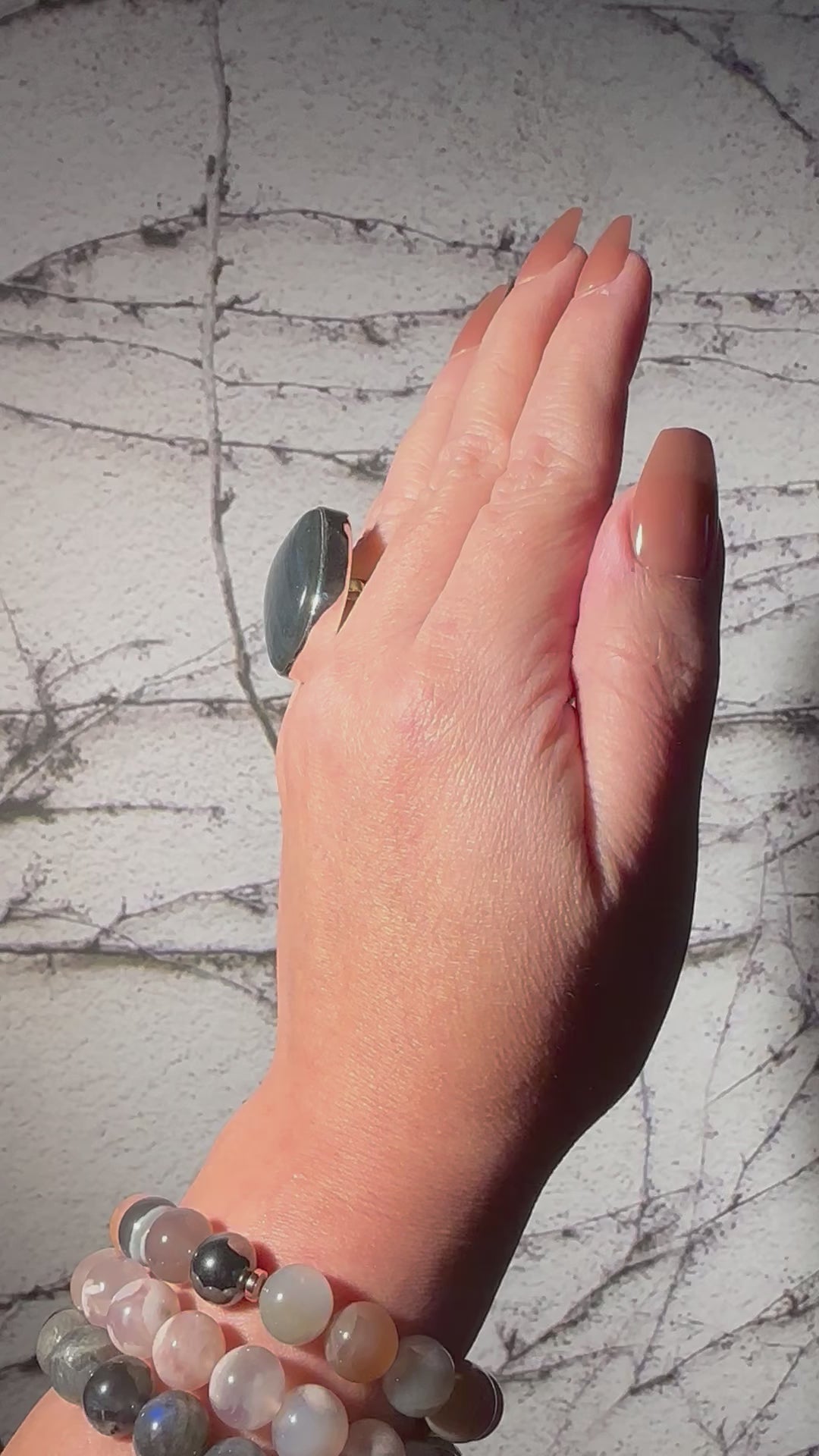 Hand picked and one of a kind! This breath-taking statement ring, free-form-shaped set in professionally-polished sterling silver holds a genuine high grade large blue Labradorite gemstone. This ring has art gallery opening night energy. Its pattern in deep royal blue will shimmer with any light. This ring is adjustable, so it will fit a variety of ring sizes. Only one available so you will get this exact same piece.