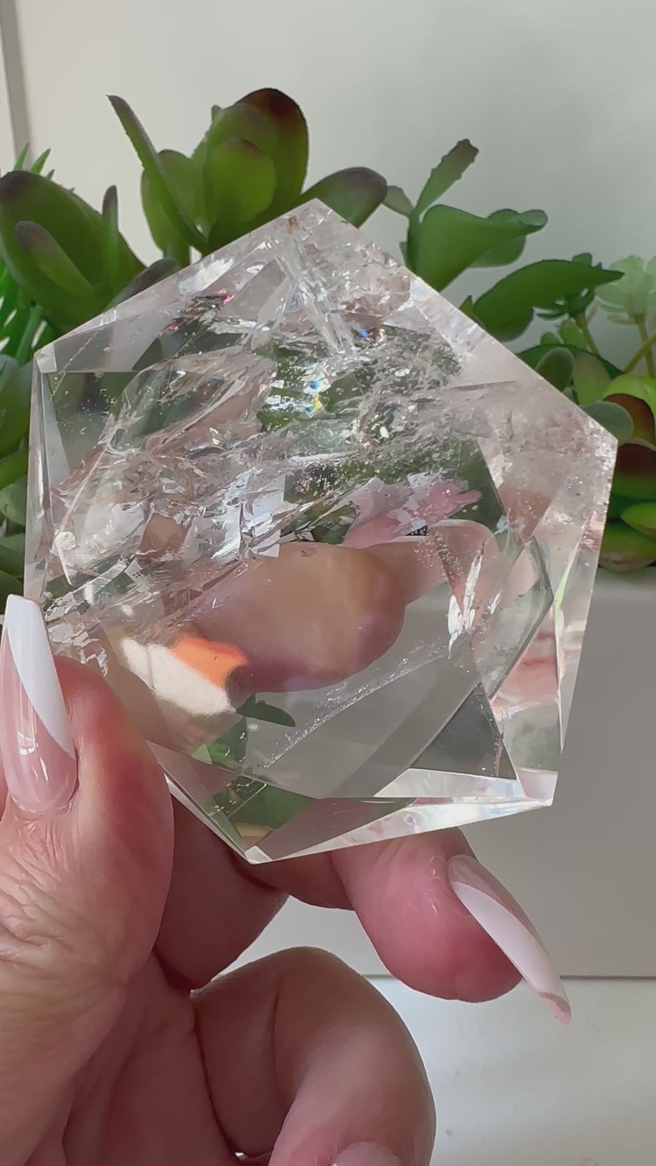 Large crystal hexagon faceted clear Quartz crystal Star of David, brilliantly mined and polished in Brazil. Best metaphysical companion. Filled with striking features like rainbows, pockets of clarity, icy strikes, veils and more.