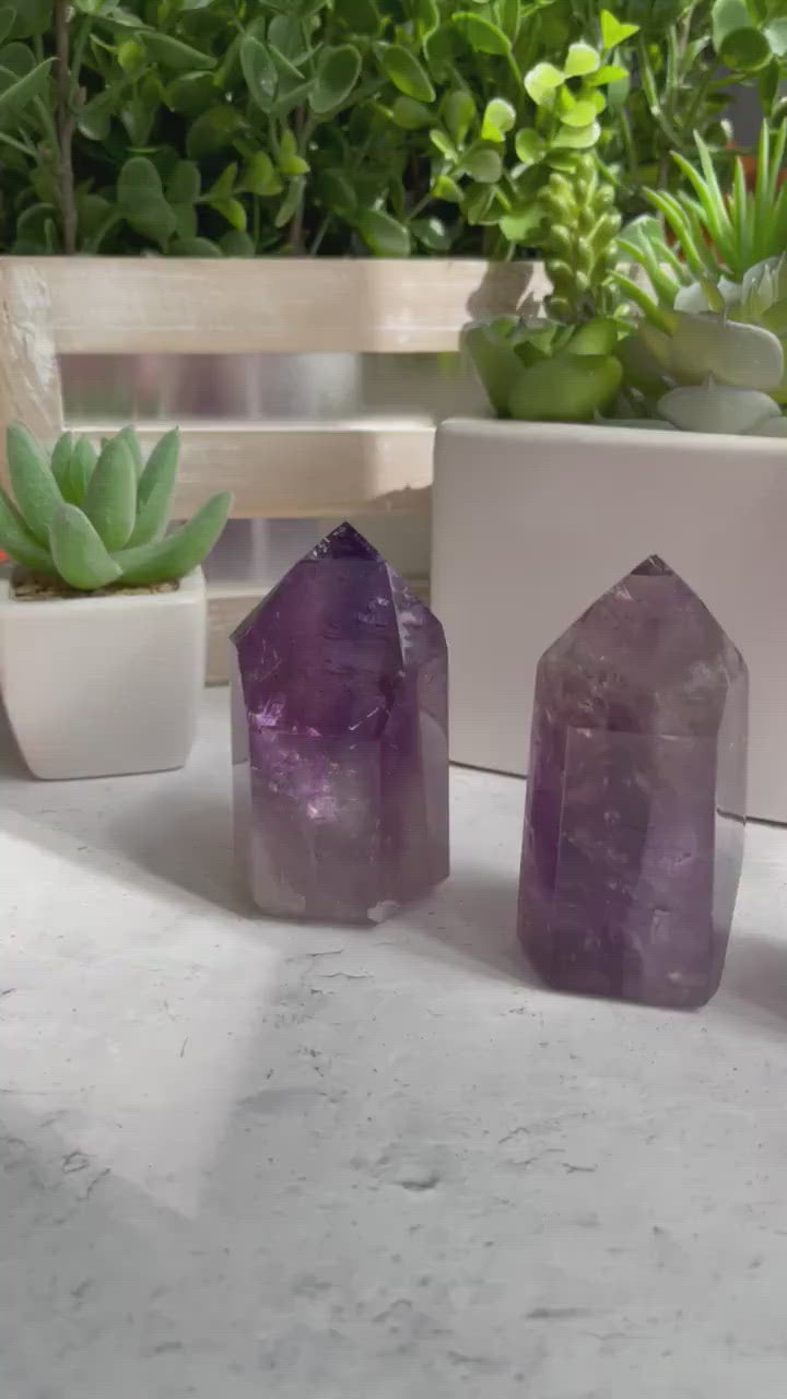 AAA grade Amethyst towers mined responsibly from Bahia, Brazil. These towers are pristine, with lots of character and unique features, and all points are intact. This lot of Brazilian Amethyst is just gorgeous and they are full of rainbows, misty layers and even smoky phantom inclusions! The color you see in these pictures is genuine and has not been altered or enhanced by any filters. Put any of these towers under sunlight and they will shine just like in the pictures. See below for details on each piece and read on for more information on what Amethyst can do for you. The video shows all towers lined up in the same order as listed below.