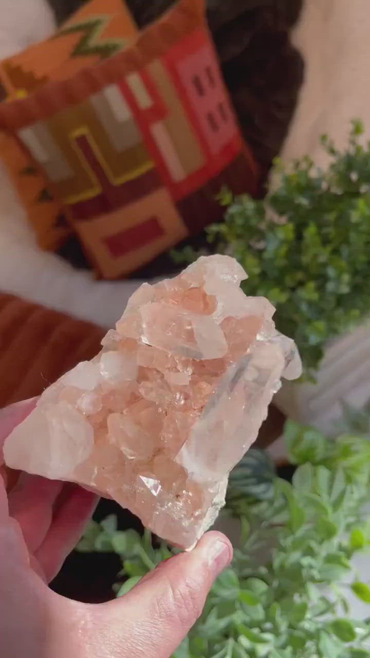 This shimmery specimen is almost 2 pounds and its pink saturation is extremely high (the pictures and video don't do justice to how pink this cluster really is!) I picked this cluster because of its gorgeous salmon-like pink hue and its beautiful clear points with lemurian-esque striations and the shorter dainty points that look like a rose crystal arrangement. You can display this piece vertically or horizontally; either way you will love staring at his gorgeous specimen. Because of its high concentration of Himalayan pink energy, this cluster will act as a filter for negative energy for you and your space. This is one gorgeous, high quality and high energy Himalayan Samadhi specimen for the avid, highly spiritual crystal collector.