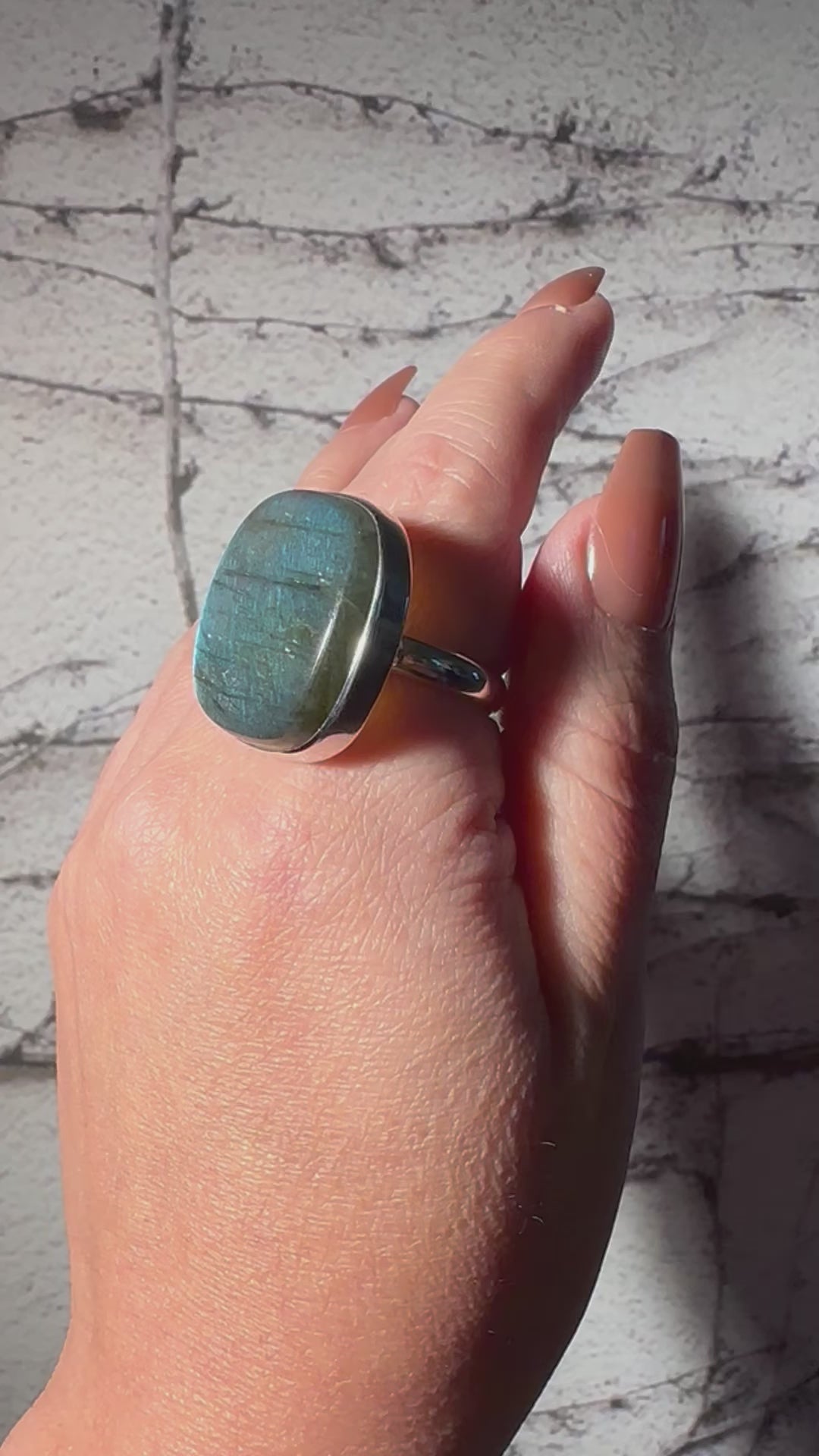 Hand picked and one of a kind! This striking statement ring, square-round-shaped set in professionally-polished sterling silver holds a genuine high grade large blue Labradorite gemstone. This ring has bold babe-boss energy. Its pattern in turquoise-ish blue and light grey will shimmer with any light. This ring is adjustable, so it will fit a variety of ring sizes. Only one available so you will get this exact same piece.