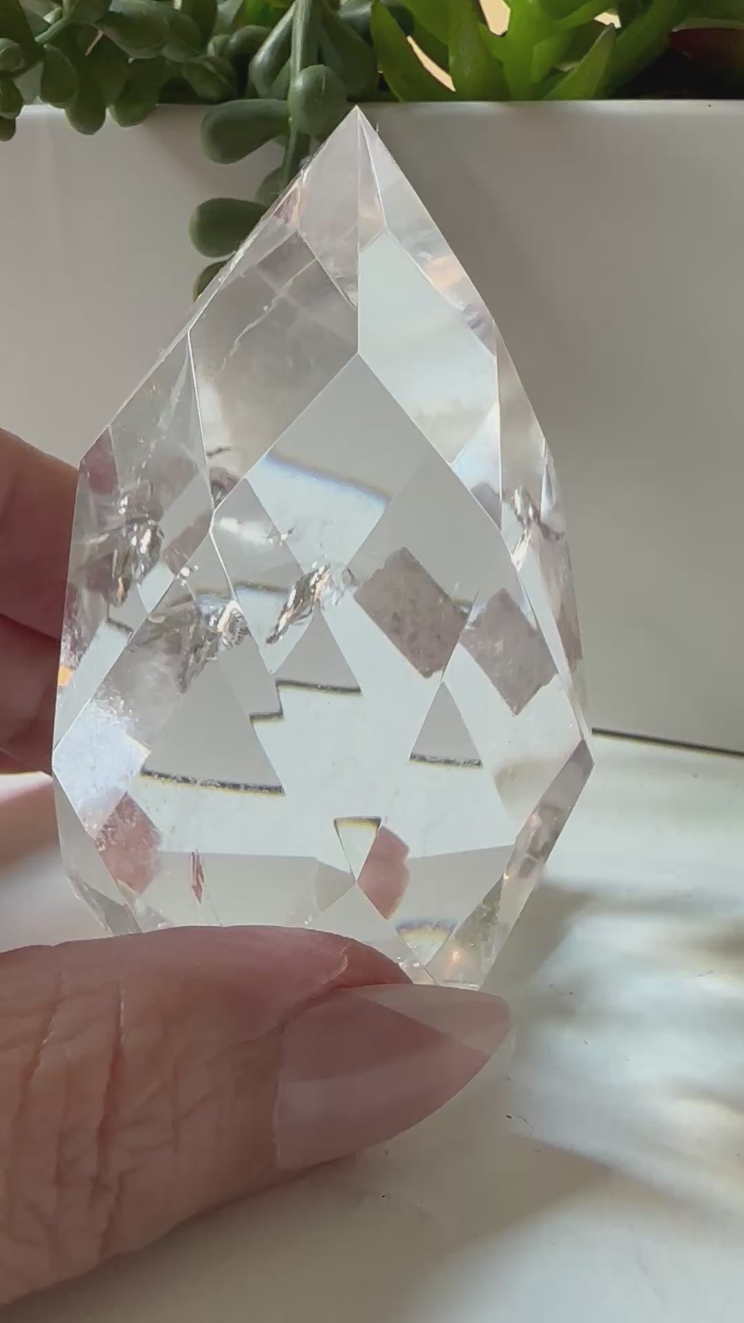 This amazing high-grade clear quartz has been masterfully polished into a multifaceted flame filled with diamond-shape facets. With a perfect point and star-octagonal base, this Brazilian specimen is almost completely clear, except for the gorgeous veils and layers in the most perfect places. This unique piece will be a perfect addition to your crystal collection.