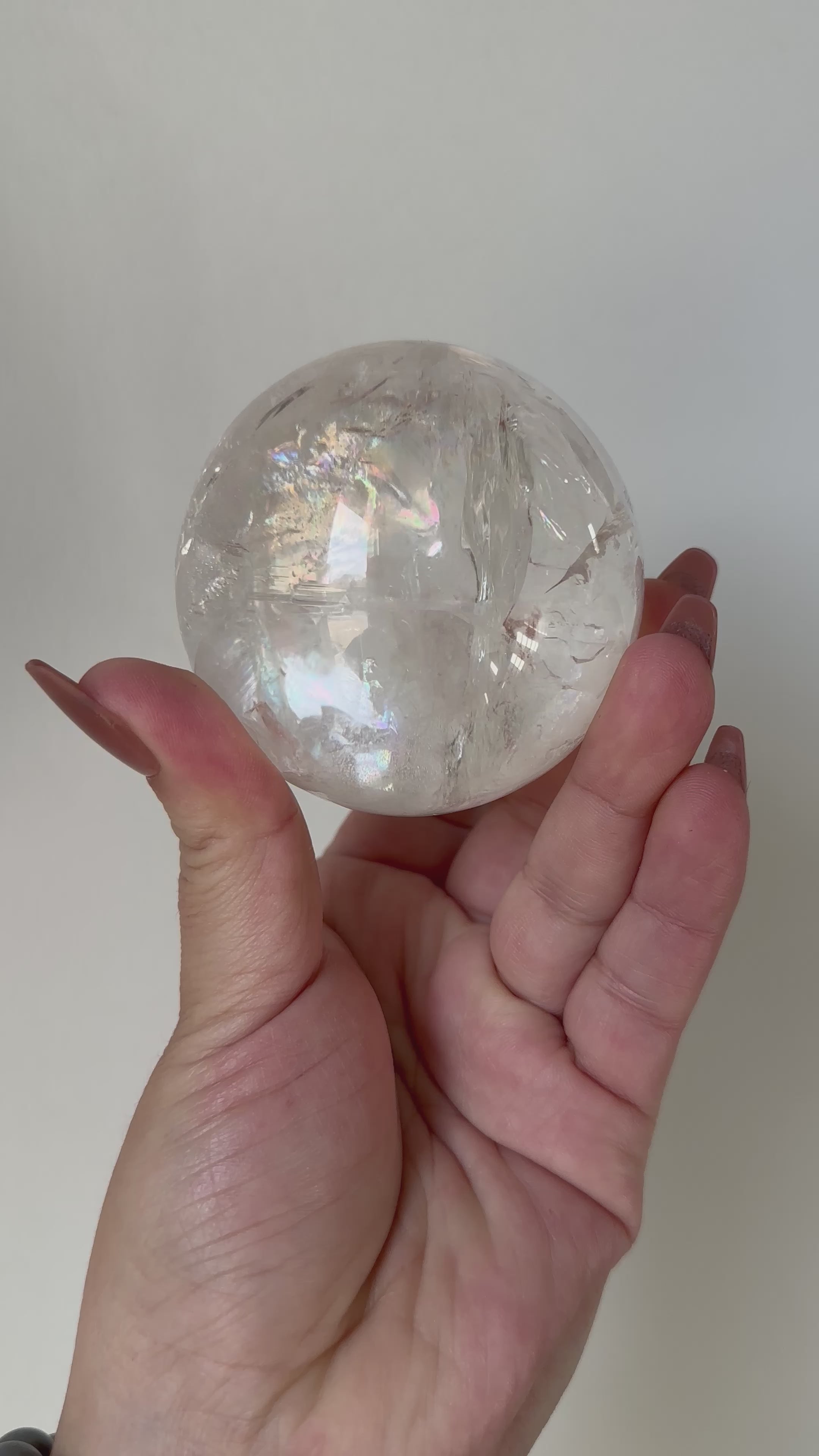 Indulge in the exquisite beauty of this high-grade Brazilian quartz specimen, adorned with stunning well balanced features. This quartz sphere comes with breathtaking rainbows that are impossible to miss, making it a must-have addition to any room.