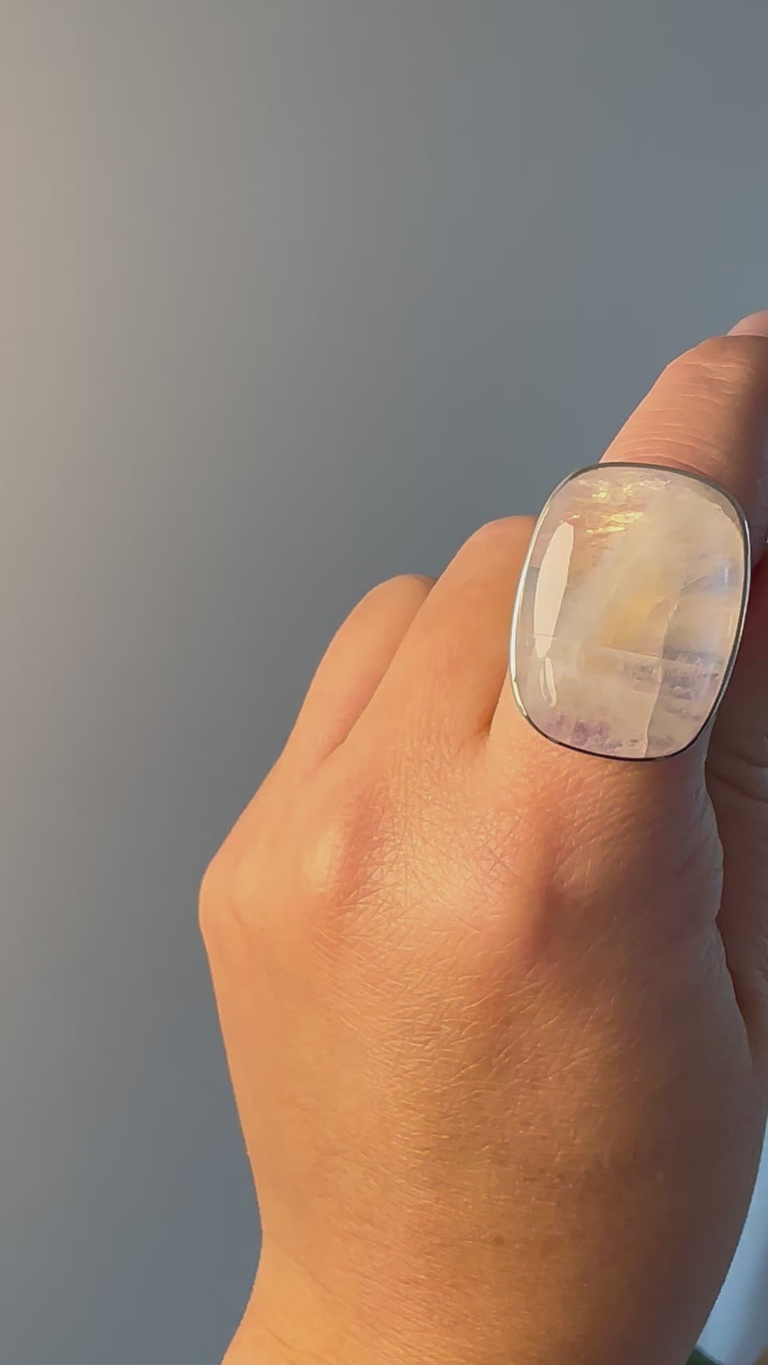 Indulge in the enchanting allure of this sophisticated and exquisite moonstone ring. This hand-picked silver ring features a large high-quality moonstone in a unique, square-round setting. The moonstone is this elegant ring beams with iridescent soft blue hues throughout. Its adjustable design allows for a perfect fit Embrace the quintessential stone of peaceful acceptance, protection, and intuition for renewed energy and a fresh start.