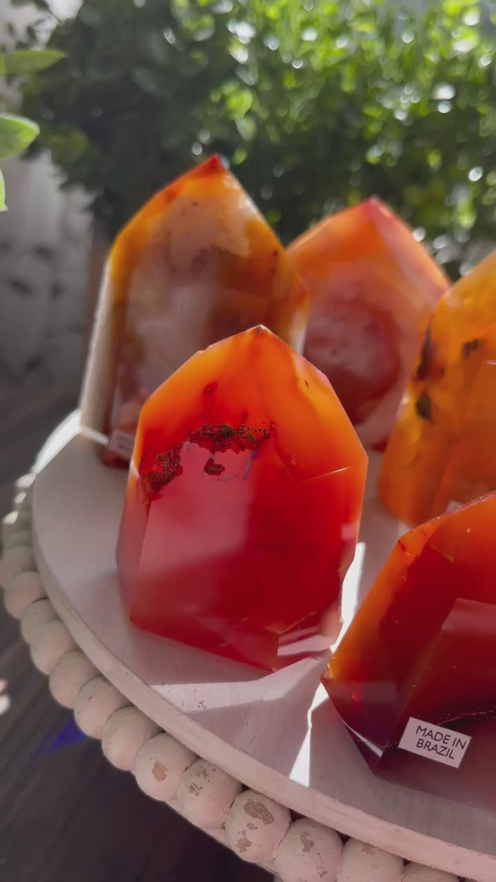 These are the most saturated carnelian I have seen in a while. Polished from high grade Carnelian from Brazil, these towers are the perfect combination of reds, oranges, quartz druzy and quartz pockets, and of course, gorgeous carnelian swirls and lines. Carnelians come to life under different lights. Natural sunlight used here to showcase their beauty (although please don't leave them under the sun for too long or they might fade.) You can also use LED lights underneath to turn the volume up on that saturation.