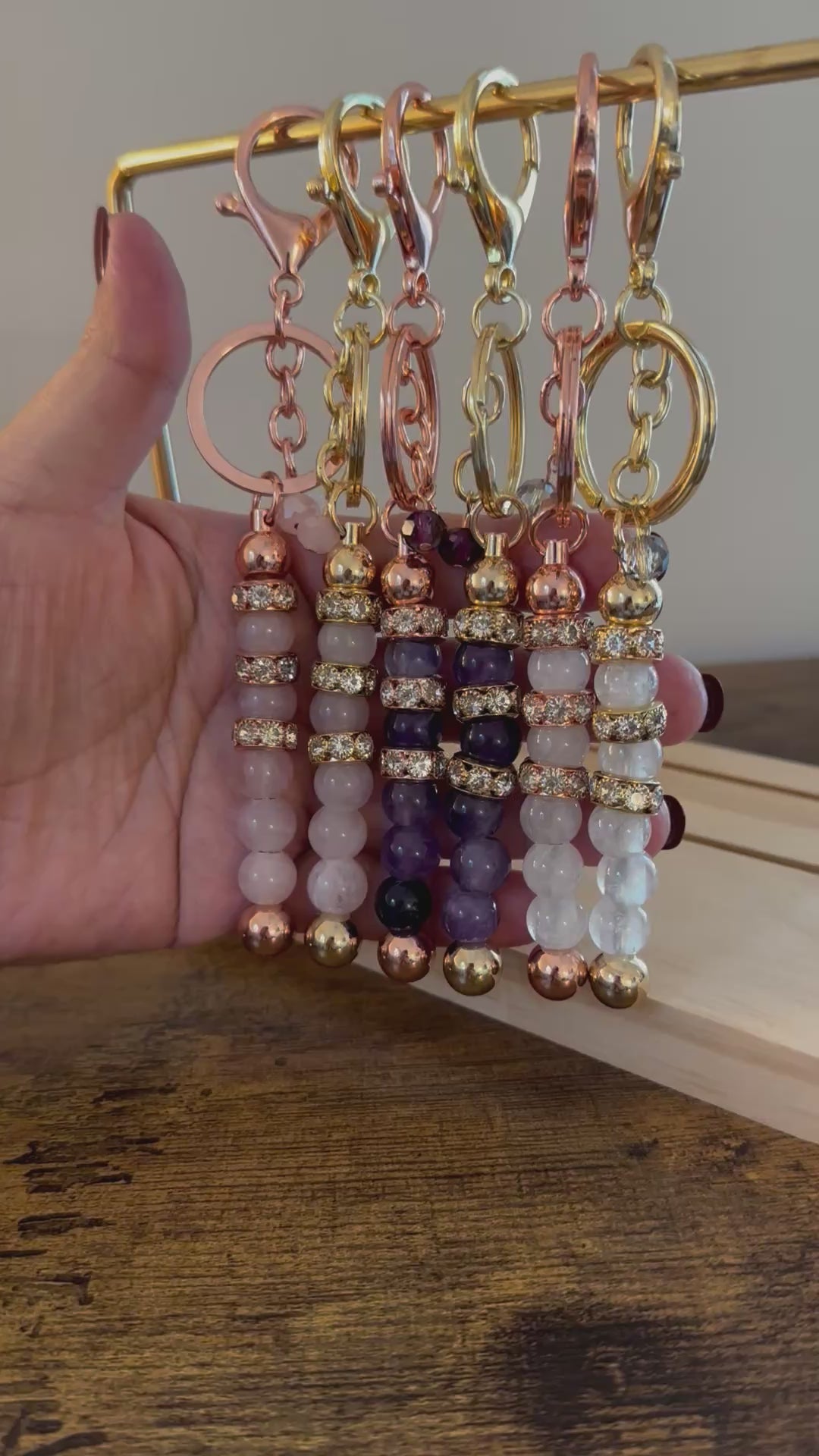 Natural Gemstone Rose Gold, Gold keychain. Rose quartz, quartz, amethyst crystal key chain.