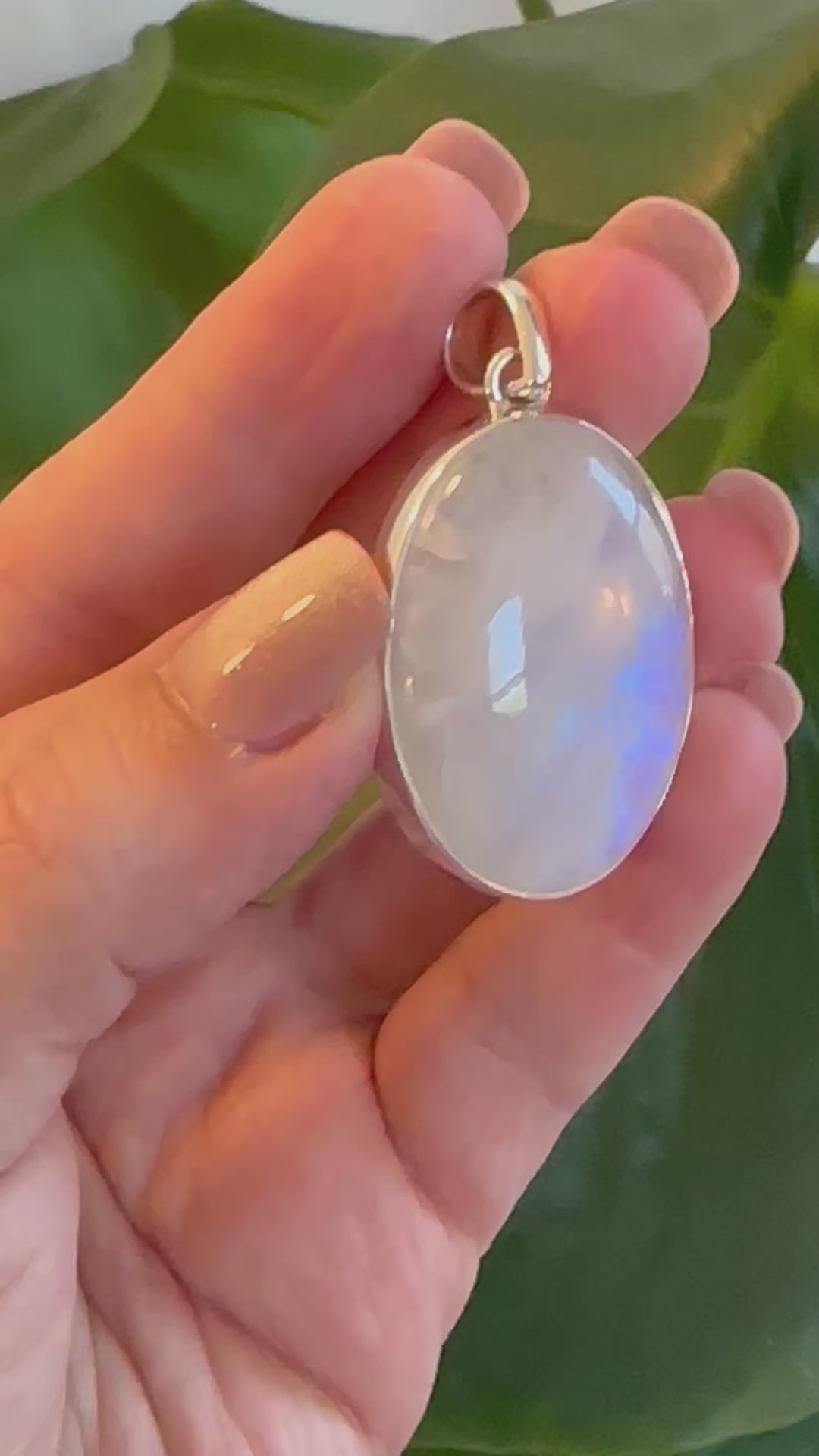 Experience ultimate tranquility while wearing this sophisticated oblong shaped moonstone pendant. Its gorgeous moonstone radiates iridescent blue hues galore. Let moonstone, the quintessential stone of peaceful acceptance, inspire and guide you towards peace and auric protection. Necklace not included.