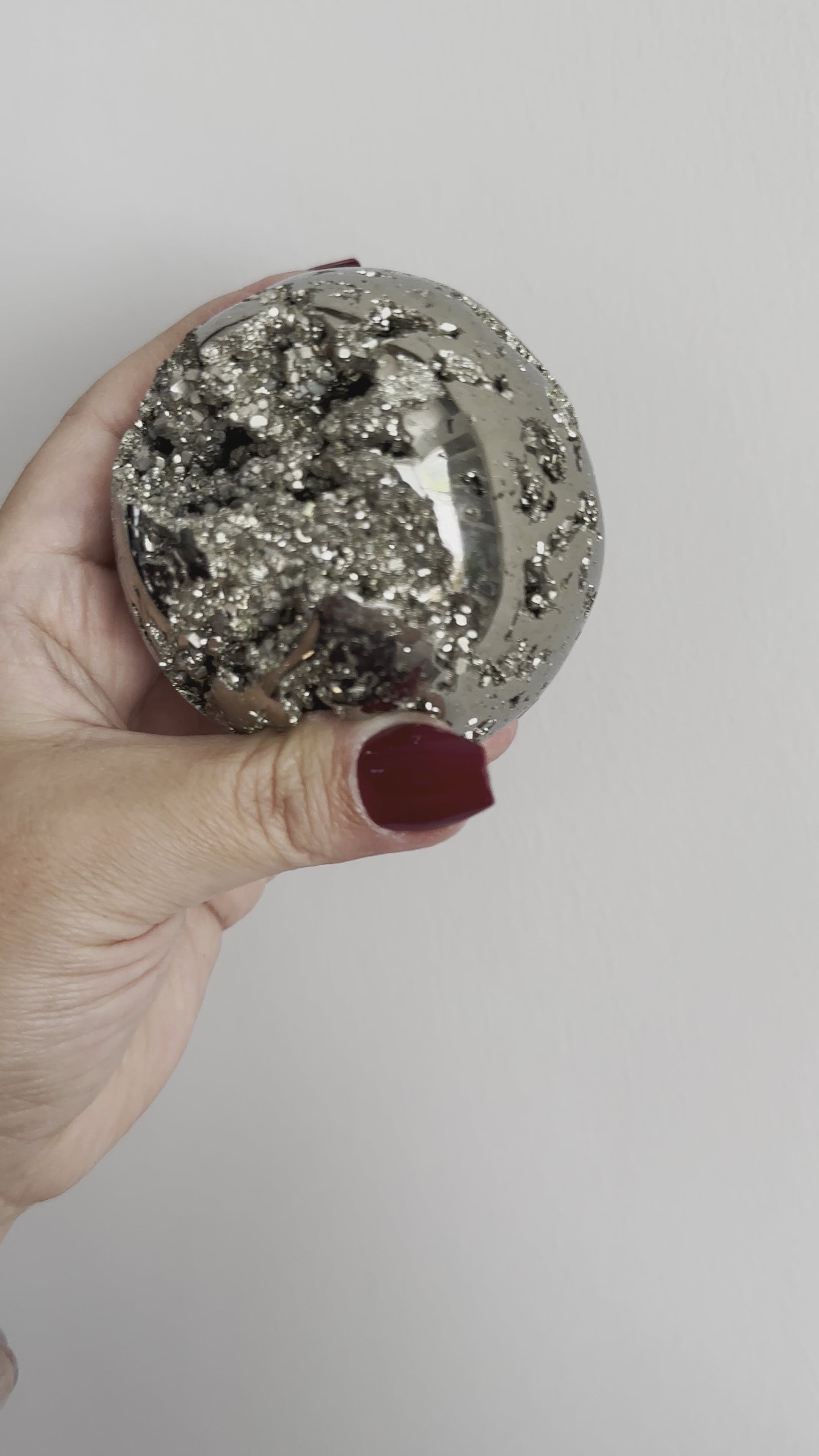 Paris is a prime Pyrite sphere from Peru that exudes sophistication, sure to draw you in with at first glance She radiates an aura of sophistication and captivating beauty. Admirers of Pyrite are encouraged to seek Pyrite sourced from Peru due to its mirror-like surface and sparkling druzy pockets.