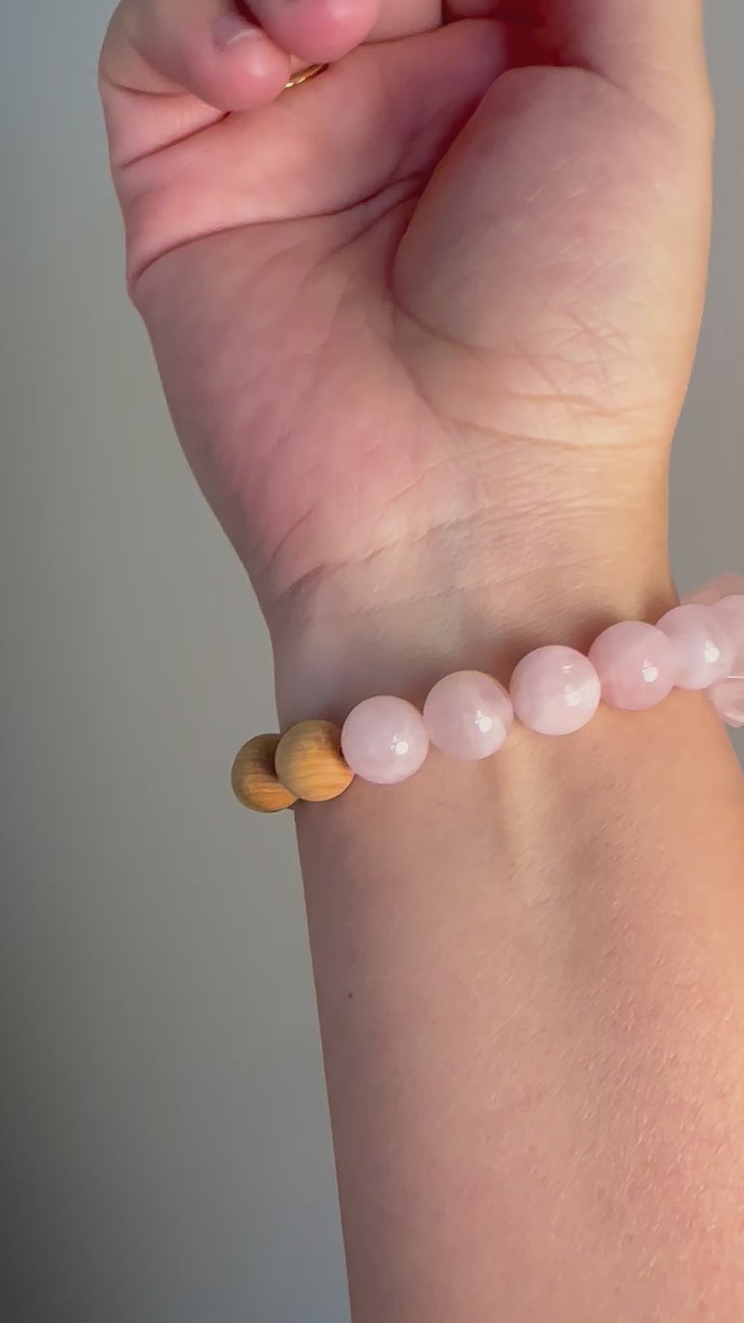 High grade Moroccan rose quartz beads with chores wood beads and rose gold accents. 100% handmade. If you need a bigger size or if you're unsure of your wrist size, please contact me.
