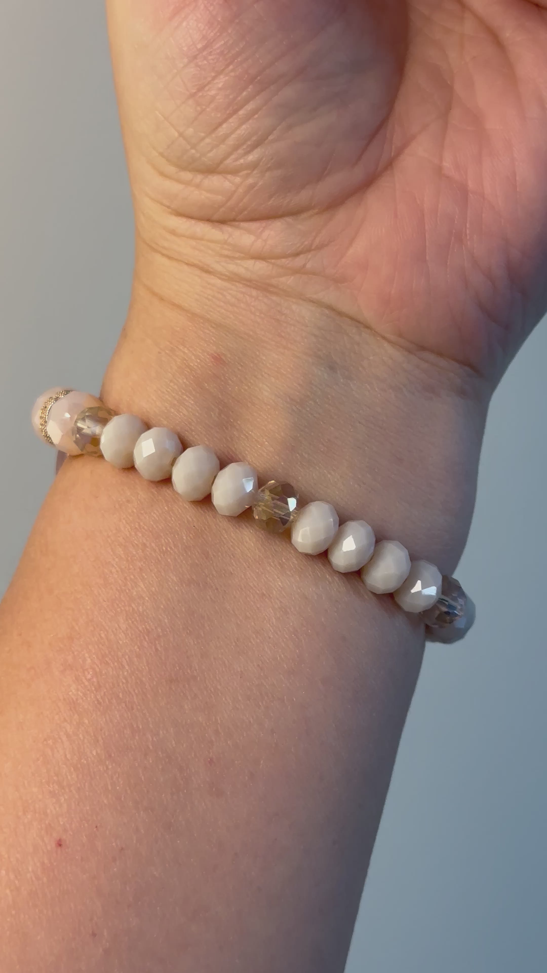Genuine high grade rose quartz gem is oblong shape measures 1.16 x1.53 inches approximately. Bracelet includes pave connectors and multi faceted beads in pink, cream and champagne colors. Bracelet fits wrist sizes 6.5 to 8.5. If you want a custom-sized bracelet, please contact me.